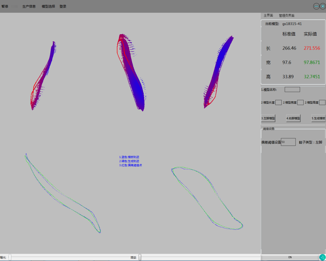 通過以上兩個環(huán)節(jié)的配合工作,流水線上的鞋坯三維信息被準(zhǔn)確捕獲,上位機接收到3D輪廓傳感器采集的鞋坯三維點云數(shù)據(jù),并對數(shù)據(jù)進(jìn)行三維測量,計算得出被掃描鞋坯的長度、寬度信息,并通過電磁閥彈推裝置對長度在不同尺碼范圍內(nèi)的鞋坯進(jìn)行分揀。同時上位機界面簡單直觀方便現(xiàn)場工作人員實時查看流水線自動檢測情況,上位機界面如下圖所示: