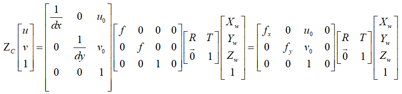 從世界坐標(biāo)系到像素坐標(biāo)系的轉(zhuǎn)換過程如下:世界坐標(biāo)系通過外參矩陣轉(zhuǎn)換到相機(jī)坐標(biāo)系,相機(jī)坐標(biāo)系通過內(nèi)參矩陣轉(zhuǎn)換到圖像像素坐標(biāo)系(這一步是通過兩步完成的,(1)相機(jī)坐標(biāo)系通過焦距對角矩陣和畸變系數(shù)轉(zhuǎn)換到圖像物理坐標(biāo)系,(2)圖像物理坐標(biāo)系通過像素轉(zhuǎn)換矩陣轉(zhuǎn)換到像素坐標(biāo)系中)。轉(zhuǎn)換過程和公式如下: